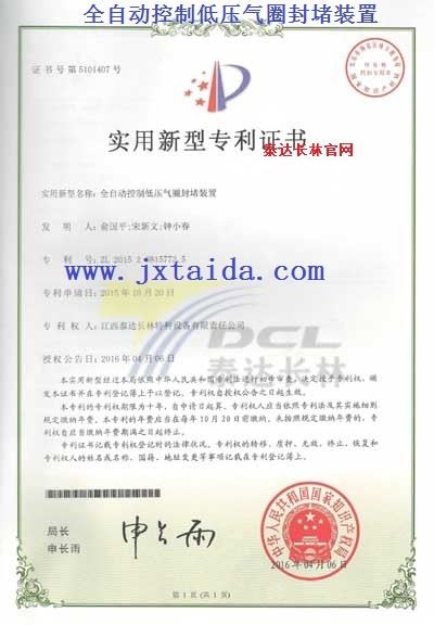 全自动控制低压气圈封堵装置-实用型专利证书